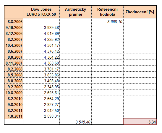 Pokud se podíváte na nějaký graf indexu DJ EUROSTOXX 50, tak uvidíte, že v uvedeném období stoupal jen po relativně krátkou dobu; většinou však klesal a trend tohoto indexu za 5 let je zjevně klesající. Odrazila se v něm totiž jednak ekonomická krize a celkový pokles hodnot akcií, tak výrazný pokles akcií v tomto létě.